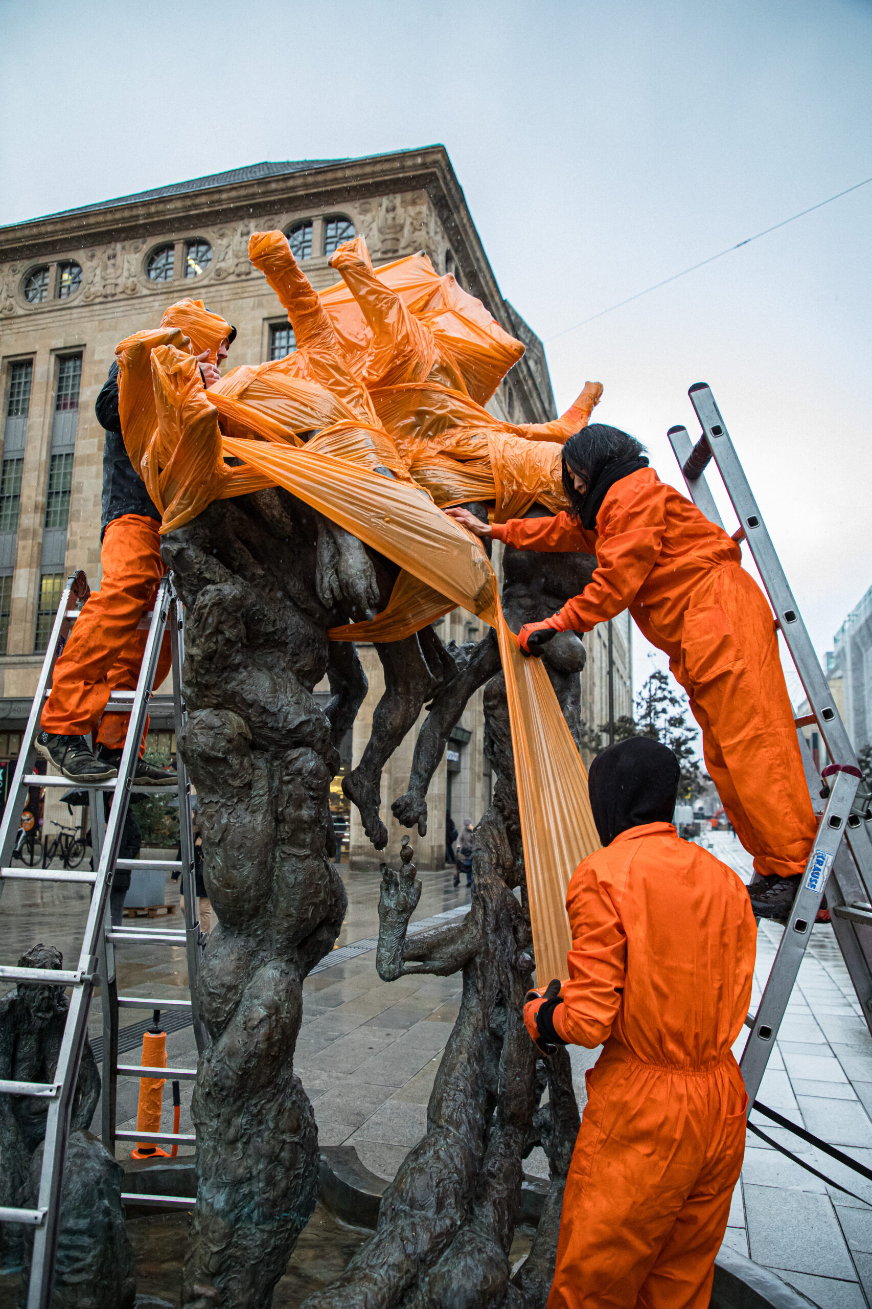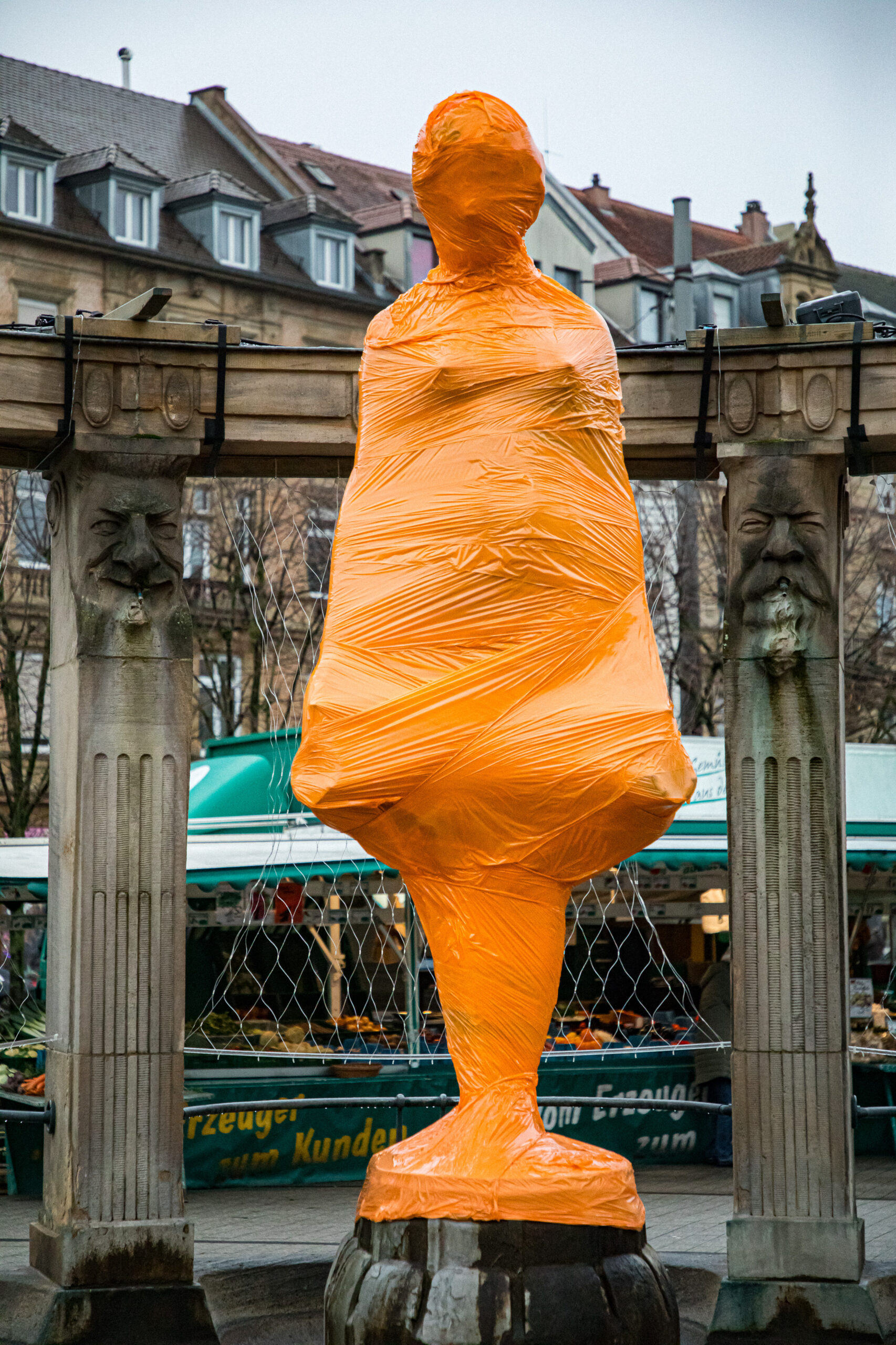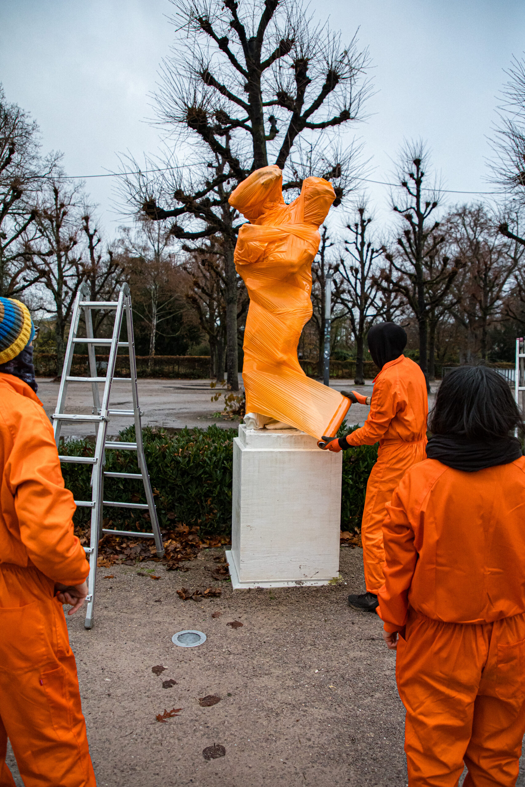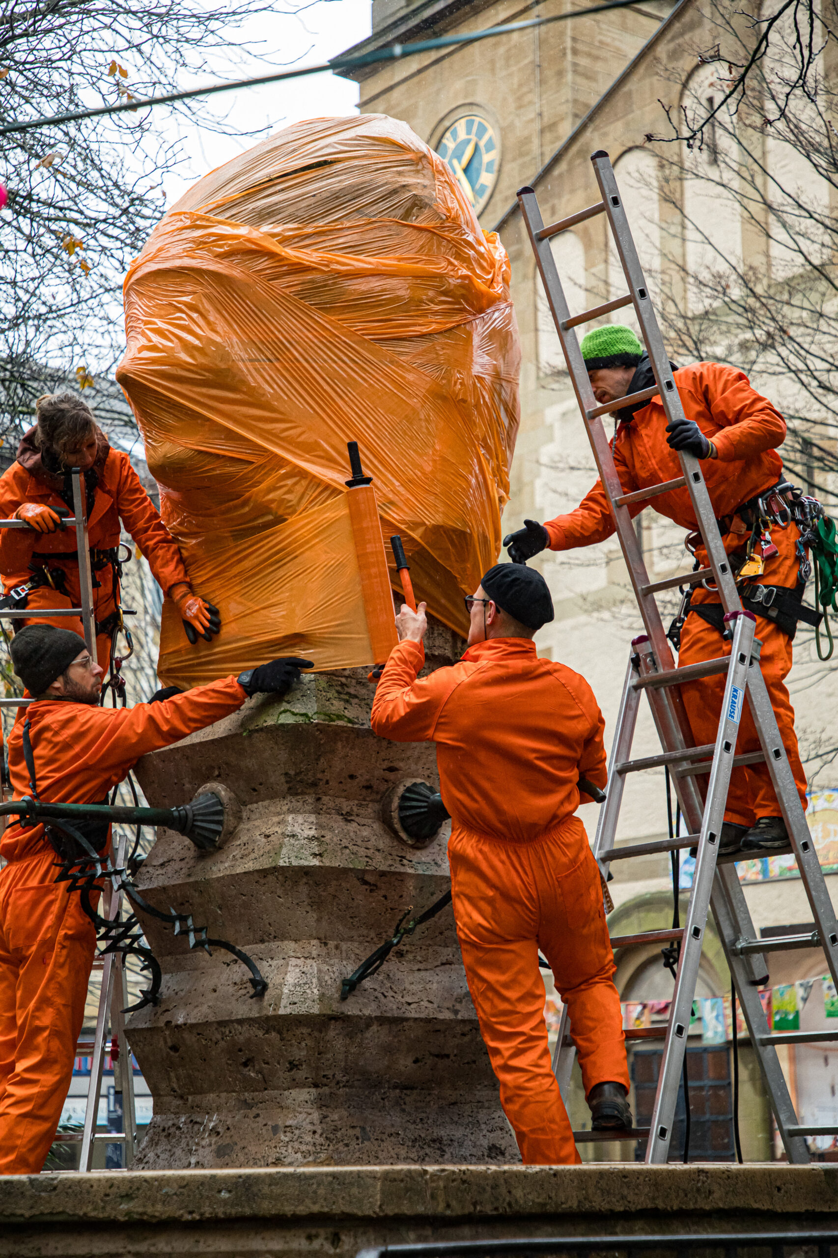 Vom 25. November bis 10. Dezember 2025 wurde die Karlsruher Innenstadt zum Schauplatz einer künstlerischen Intervention des Wissenschaftsbüros der Wirtschaftsförderung Karlsruhe, des Francis Karat Kollektivs und der Kunstagentur ato. Ausgewählte Denkmäler wurden 16 Tage lang orange verhüllt und über QR Codes mit einer digitalen Ebene verknüpft, die Informationen tiefergehende bereitstellte.